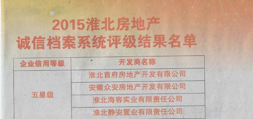 入選2015淮北房地產(chǎn)誠(chéng)信檔案系統(tǒng)企業(yè)信用五星級(jí)